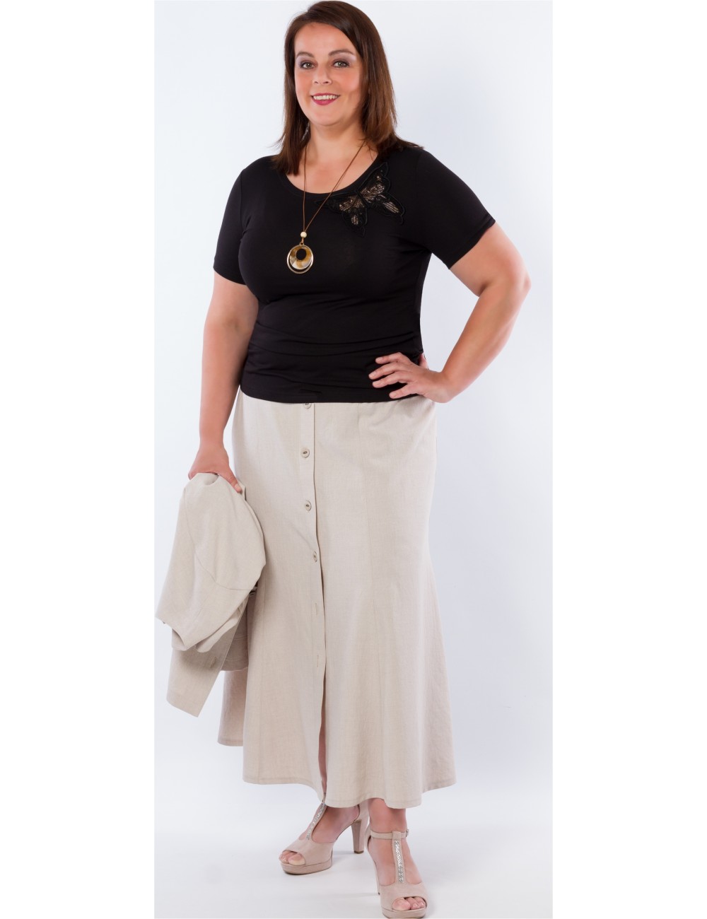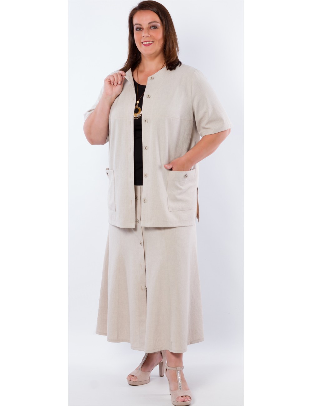 Hit sezóny - LEN s nemačkavou úpravou. Propínací sukně na knoflíky, po bocích s gumou. S kabátkem LENOR nebo LIAM tvoří perfektní vycházkový kostým. Nabízíme tři délky. Střih na vaši postavu ZDARMA upravíme, napište nám vaše míry.